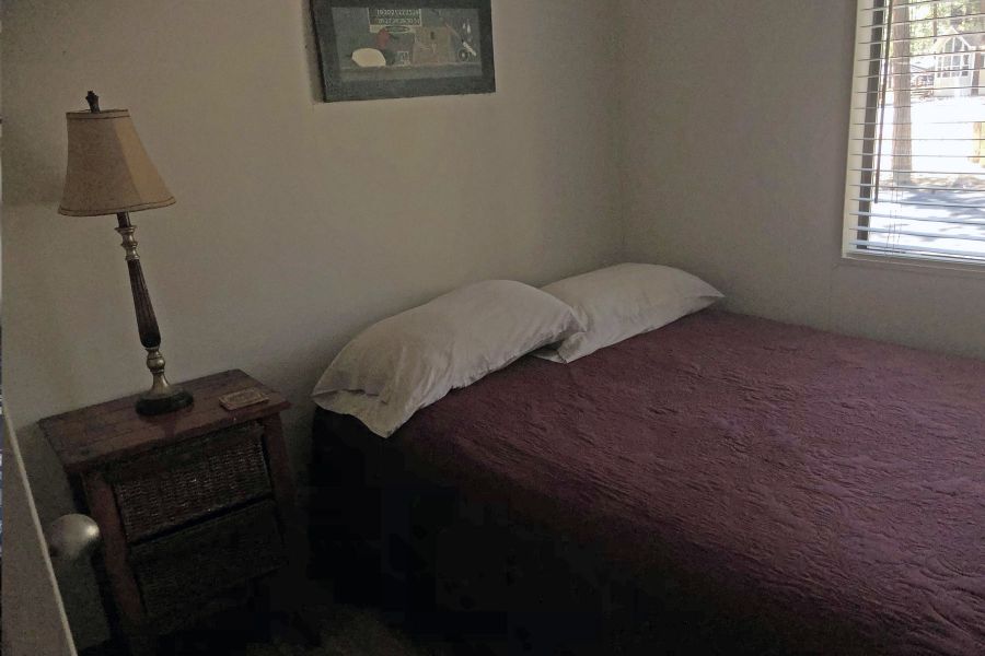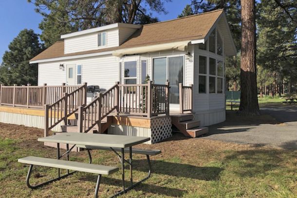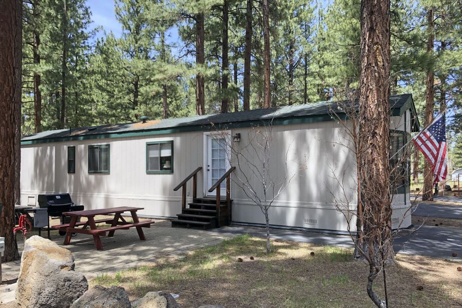 The Eagle's Retreat is a 2 bedroom, 1 full bath mobile home featuring a large living area with large TV and Satellite TV service, a large kitchen with center bar, and a paved brick patio.