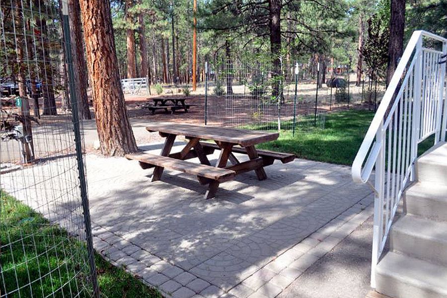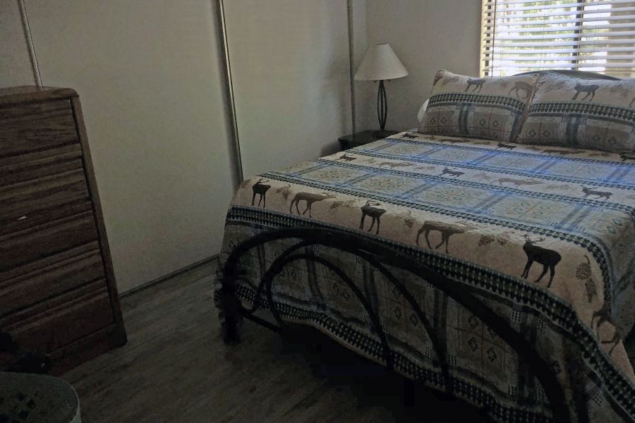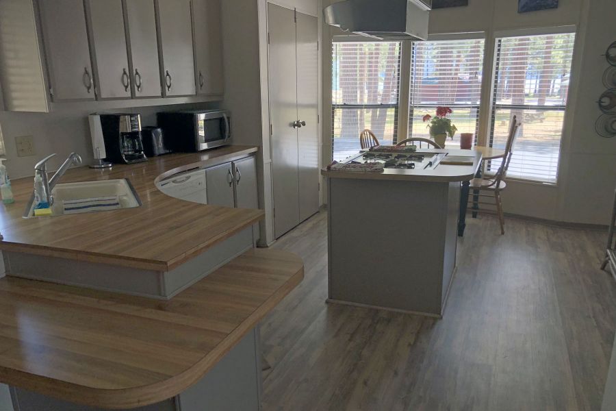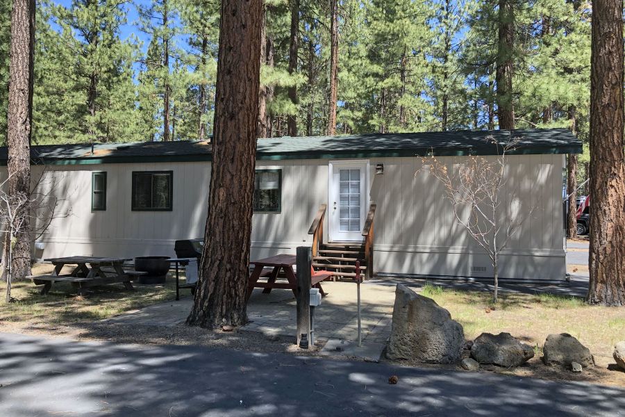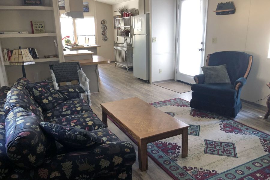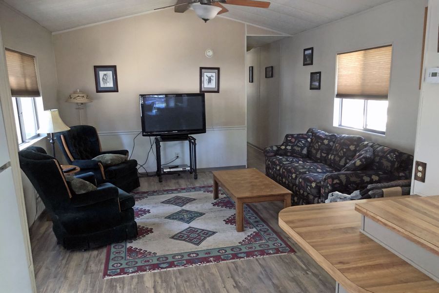 The Eagle's Retreat is a 2 bedroom, 1 full bath mobile home featuring a large living area with large TV and Satellite TV service, a large kitchen with center bar, and a paved brick patio.